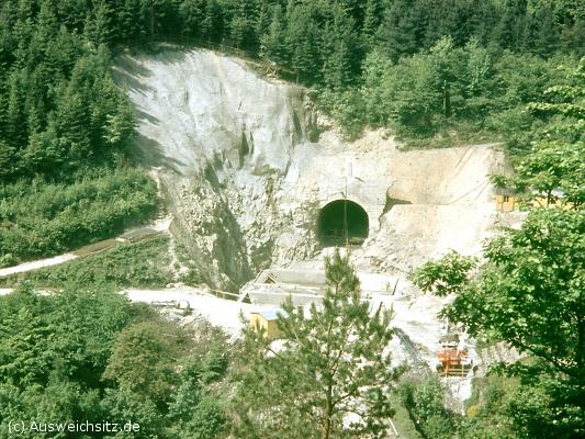 Baustelle im Sommer 1962: Das Fundament für das Außenbauwerk 123 entsteht. Da der rückwärtige Teil des Berges großräumig abgetragen wurde, ist auch die Wegeverbindung über den Eingangsbereich hinweg gekappt. Oben links ist das Gelände gegen Abrutschen mit Spritzbeton stabilisiert.