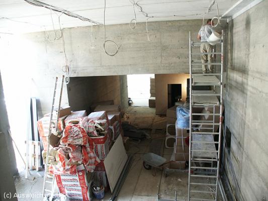 Blick aus dem Büroraum des Museums in den Kinosaal und den Eingang in den eigentlichen Bunker. Hier standen noch vor wenigen Monaten meterhohe Sträucher. Der dunklere Beton rechts und in der Mitte ist der gereinigte alte Außenteil der Anlage, rechts unten ist deutlich der Ausschnitt für die Panzerverglasung zu sehen. Bewusst wurden alte und neue Betonflächen gegeneinander abgesetzt. Die Besucher werden über den Zugang im hinteren Bildteil in die Anlage gelangen.