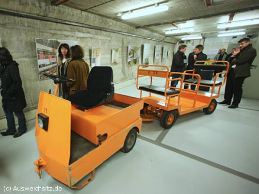 E-Karren zur Personenbeförderung. Jeder Bereich hatte auch bei den Transportfahrzeugen seine eigene Farbgebung: Feuerwehr rot, Bergrettung blau, technische Einrichtung des Regierungsbunkers orange.