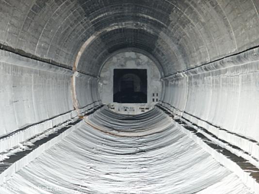 Zwei starke Lampen schaffen Einblicke. Das Stollensystem ist gut ausgeleuchtet und man kann erahnen, welche Dimension vor einem liegt. Erst auf Höhe des zweiten Brandschottes (Bildhintergrund), die im Zuge des Rückbaus eingezogen wurden, beginnt der Bereich der Macht. Hier lagen die Unterkünfte und Arbeitsräume des Kanzlers, des Kabinetts und Gemeinsamen Ausschusses, des Bundesinnenministeriums oder des Bundesverteidigungsministeriums.