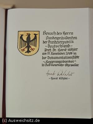 Unterschrift des Bundespräsidenten im Gästebuch der Dokumentationsstätte Regierungsbunker, das jedem Besucher offen steht.