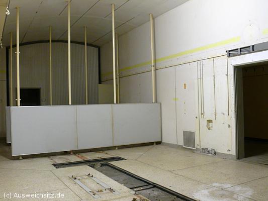 Hier wird seit 20 Jahren nicht mehr gekocht: Leergeräumte Küche mit den grauen Trennwänden zwischen Zubereitung und Kochstellen (2007). Zu den Kommandostabsübungen im Regierungsbunker war der Postbunker nie mit seiner Maximalbelegung von 120 Personen besetzt. Auch wurde das Notnetz der Bundespost nur in den 70er Jahren mitgefahren, später wurde die Technik außerhalb der Großübungen getestet. Ebenfalls im Unterschied zum Übungsalltag im Ausweichsitz machten sich die Postangestellten zum Feierband auf den Heimweg.