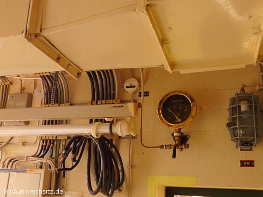 Explosionsgeschützte Notbeleuchtung in der Kommandozentrale, daneben das Messgerät für Überdruck im Bunker, der gasförmige Kampfstoffe aus der Anlage herausdrücken sollte: Grundsolide, einfache Technik sollte das Überleben im 3. Weltkrieg sichern.