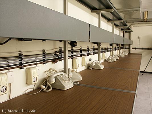 Krisenmanagement: Lageraum mit mehreren Telefonapparaten sowie riesigem Leuchttisch für übereinander projizierte Karten.
