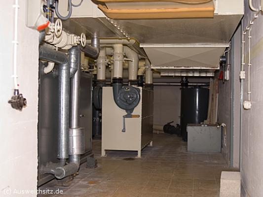 Maschinen für die Luftversorgung im Bunker. Im Falle eines Stromausfalles gab es auch hier die Möglichkeit, das System per Handbetrieb am Leben zu erhalten und eine Kurbel für den Antrieb (Bildmitte).