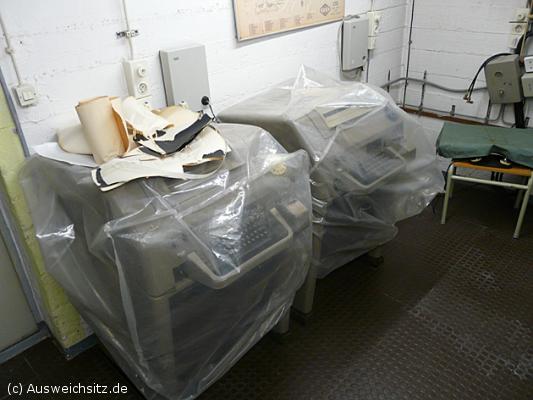 Eingepackte Fernschreiber im Raum der Fernmeldetechnik mit 35 Jahre alten Originalpapierrollen.