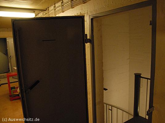 Seitenflur mit Zugang zum Treppenhaus. In der Anlage gab es zwei Treppenhäuser (im Bild das für die Wendeltreppe) sowie einen Aufzugschacht als Verbindung zwischen den beiden Etagen. Im Bildhintergrund links liegt die Tür zum Sandfilter, über den eine Nottreppe ins Freie führte.