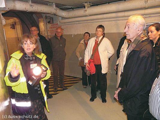Fotos aus der Bauzeit (im Zugangsbereich des Bunkers zwischen 1. und 2. MAN-Tor) geben den Besuchern einen Einblick in die Zeit, als hier alles entstand. Die Fotos stammen von Herbert Henning, als stellvertretender Oberbauleiter zwischen 1959 und 1968 auch als Bunker-Fotograf durch den Bund zugelassen. Dessen Familie (im Bild) sieht sich die Fotos und den Bunker im September 2008 an.